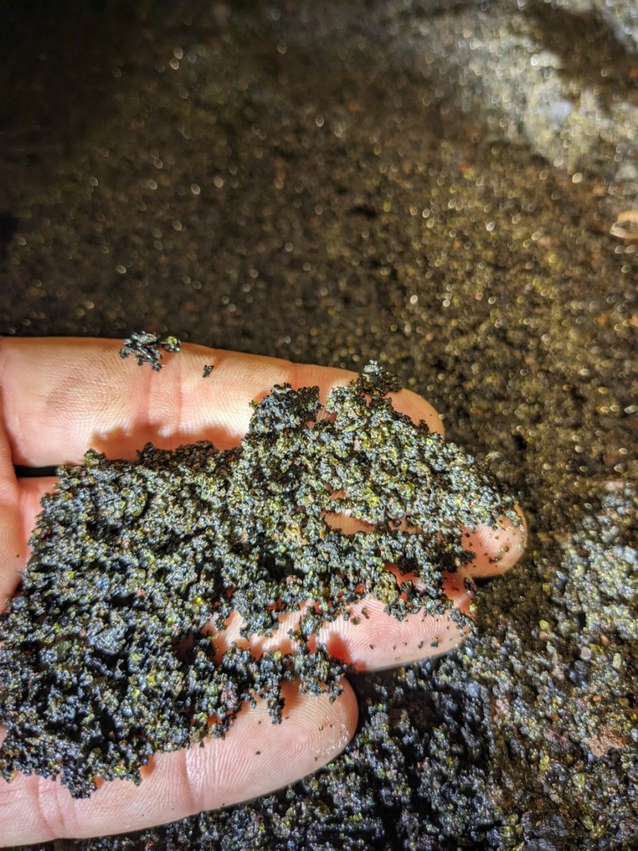Il pleut relativement souvent, dans le sud sauvage. De plus il fait 23 à 25° dans le tunnel avec plus de 90% d’humidité dans l’air. Nous ressortons donc humidifié par le tunnel (ou par notre sueur!). Par contre il n’y a pas de sédimentation dans le tunnel, aussi les vêtements restent propres.